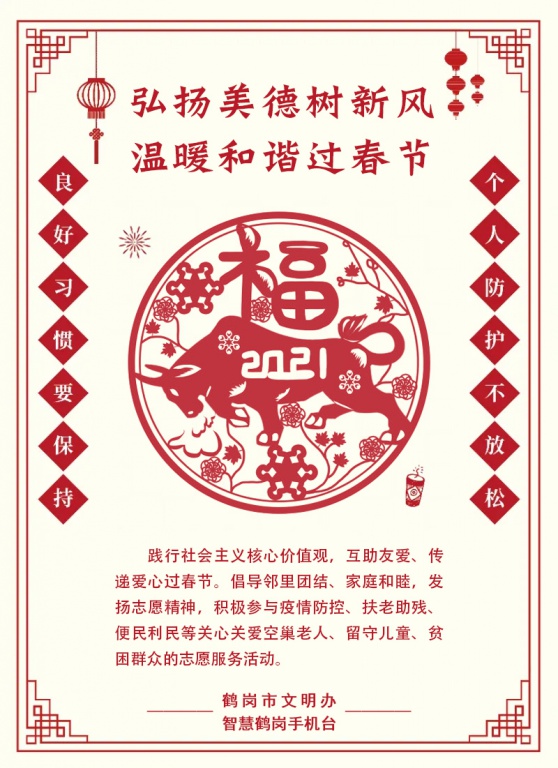 鹤岗最美、因为有你。广大市民朋友们,新年新气象,新年新风尚。让我们每个人都从自身做起,讲文明树新风,弘扬社会公德,共度欢乐祥和的新春佳节,共建幸福和谐的美好家园。